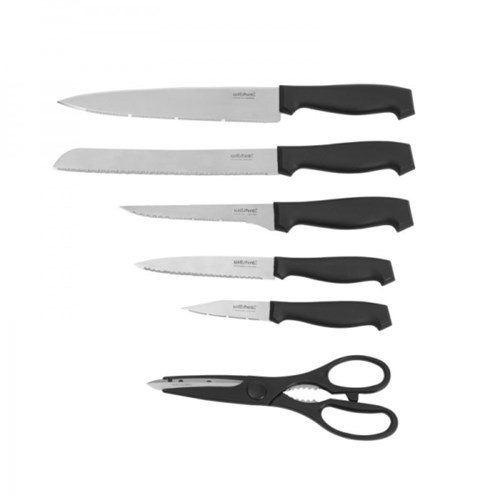 • Includes: paring knife, utility knife, boning knife, bread knife, cook's knife and kitchen shears.