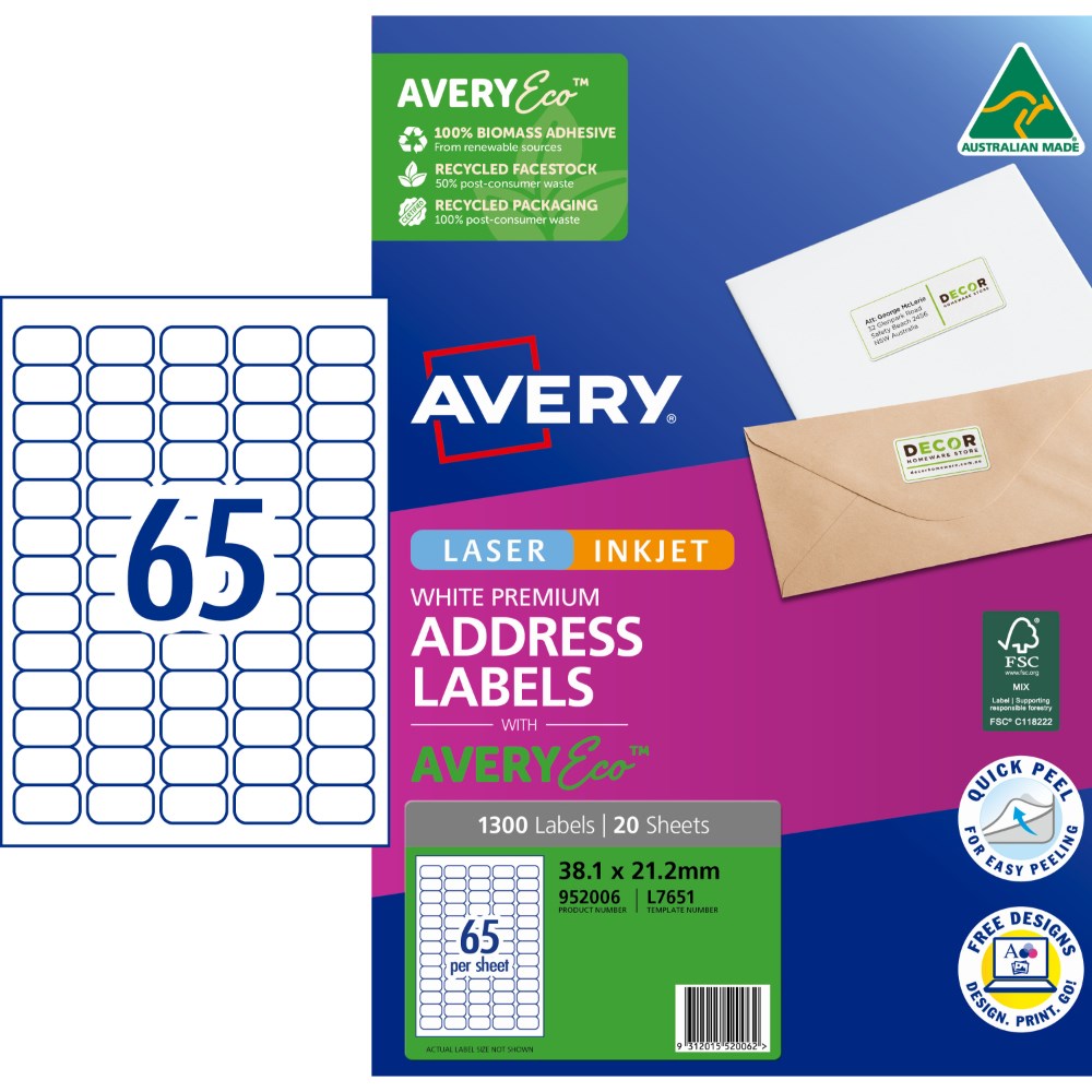 Avery Premium Address Labels White Laser Inkjet AveryEco L7651 38.1x21.2mm 65UP 1300 Lb