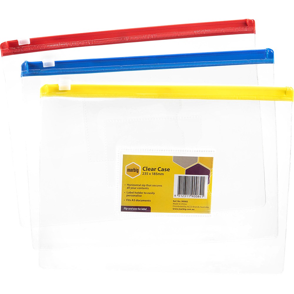 Marbig Clear Case A5 235 x 185mm With Coloured Zip Assorted