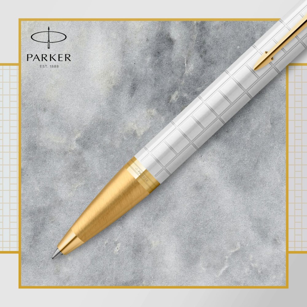 • Elegant pearl lacquered body engraved with a modern asymmetric square pattern is complemented by gold trims and the signature Parker arrow clip.