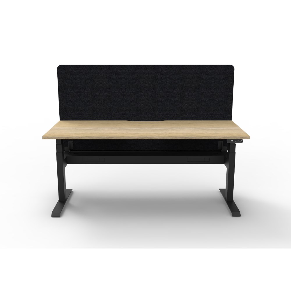 • Natural Oak top with rigid edging and 50mm deep scallop cut out. Black Satin powder coat frame. Eco screen and cable tray.