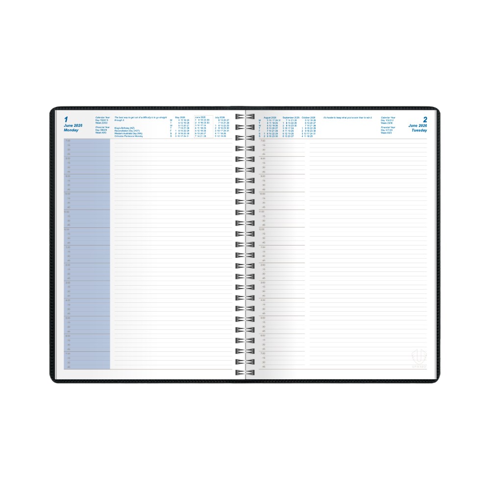 • Featuring a padded, phthalate free, PVC cover, pockets for storing business cards and wire-o binding to allow the diary to lie completely flat when open.
